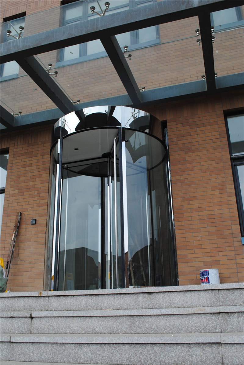 3)弧形自动门:一般分为双扇门和单扇门。双扇门一般由四扇金属框或玻璃弧形门翼组成,弧壁,天花板,华盖,角座,外包饰,安全设施,灯等。自动运行弧形平滑门有两个驱动电机,可自动反转,安全可靠,备有操作控制板和急停按钮。电源出现故障可使用后备电源,平滑门根据华盖正前方的红外线感应器自动运行。弧形门有动扇和定扇个两页,门开启时,两动扇在弧形轨上安静,平稳的反向滑行,并与定扇重叠,形成一个方便,宽敞,流线型的出,入口,令人赏心悦目。结构简洁大方的弧形门,可配合时尚间建筑在出,入口外观上的具体要求,创造良好的三维视觉效果。弧形平滑门的结构可以是半圆形,椭圆形,圆形门,弧面像向里或向外的门。在一些没有足够空间安装传统平滑门的场所,弧形门是最佳的选择,它在充分利用空间的同时,又提供了一个完美的自动化的出,入口。弧形门优美,柔和的弧形外观造型配以晶莹剔透的玻璃门窗,效果更佳。